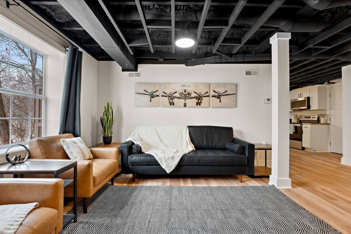 A few stairs are required to enter the unit. This is a historic building with three separate units, one in each floor. Each unit has a separate entrance. Although we have taken painstaking measures to soundproof the building as much as possible, it is still a historic building and some sound may travel between units. We ask that guests in all units please be considerate of each other.